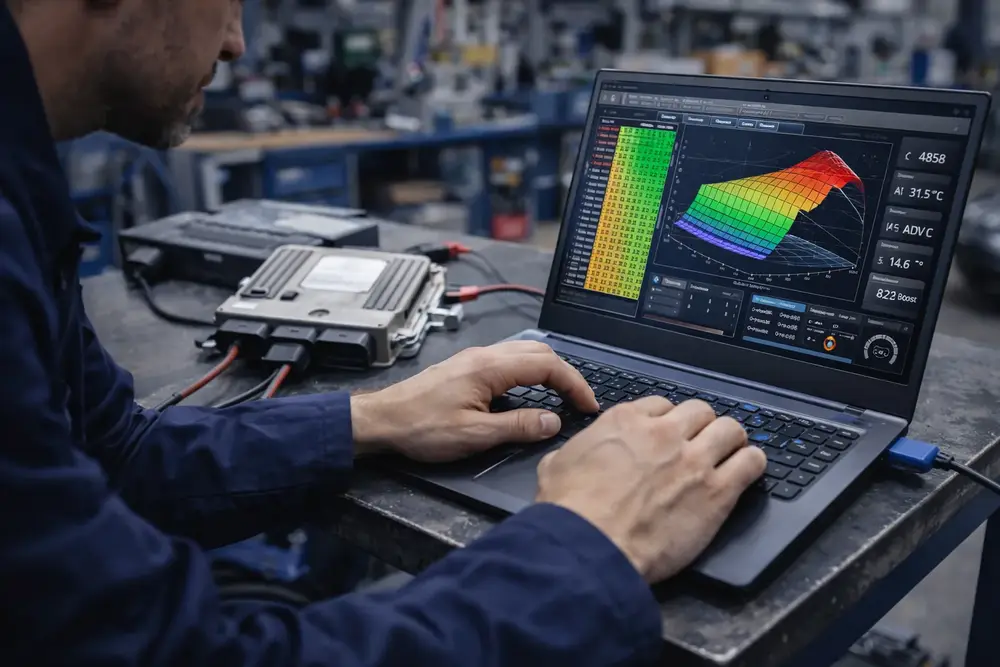 La rimappatura della centralina ECU consiste nella modifica calibrata dei parametri di gestione del motore, intervenendo su valori come pressione turbo, tempi di iniezione, anticipo accensione e limitatori elettronici.